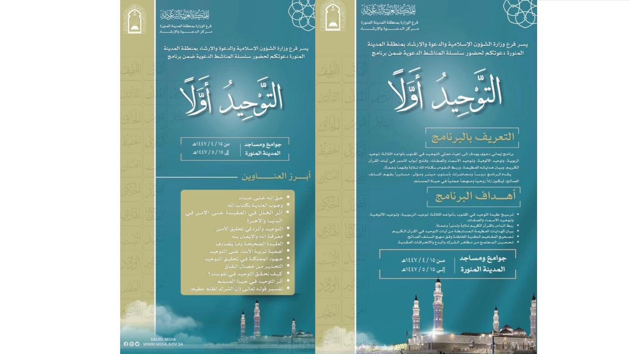 أخبار فرع الشؤون الإسلامية بالمدينة المنورة ينفذ سلسلة من الدروس والمحاضرات الدعوية ضمن برنامج "التوحيد أولاً" ينفذ فرع وزارة الشؤون الإسلامية والدعوة والإرشاد بالمدينة المنورة، سلسلة من الدروس والمحاضرات الدعوية، وذلك ضمن برنامج "التوحيد أولاً" الذي يبدأ اليوم الثلاثاء الخامس عشر من شهر ربيع الآخر ١٤٤٧هـ، ... التفاصيل