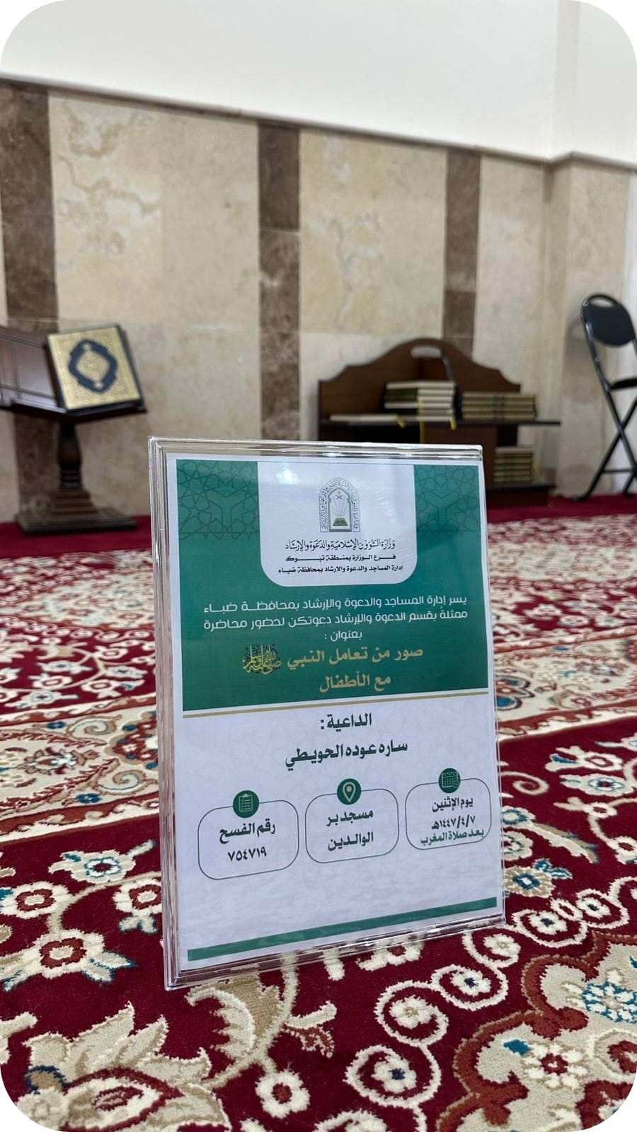أخبار الشؤون الإسلامية بالقصيم تنفذ عدداً من المناشط الدعوية النسائيةنفذ فرع وزارة الشؤون الإسلامية والدعوة والإرشاد بمنطقة القصيم، ممثلاً بمركز الدعوة والإرشاد بمدينة بريدة، تنفيذ عددٍ من المناشط الدعوية النسائية، ليوم الاثنين 14 ربيع الآخر 1447هـ مجموعة من المحاضرات ... التفاصيل