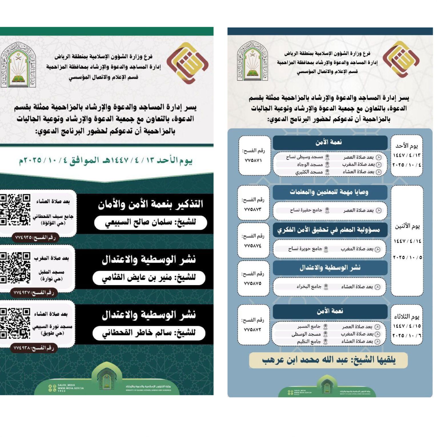 أخبار فرع الشؤون الإسلامية بالرياض ينفذ عدداً من الدروس والكلمات الدعوية في محافظات المنطقةنفّذ فرع وزارة الشؤون الإسلامية والدعوة والإرشاد بمنطقة الرياض، ممثلاً بقسم الدعوة التابع لإدارة المساجد والدعوة والإرشاد، عددًا من المناشط الدعوية، شملت محاضرات في عدد من الجوامع والمساجد خلال الأسبوع ... التفاصيل
