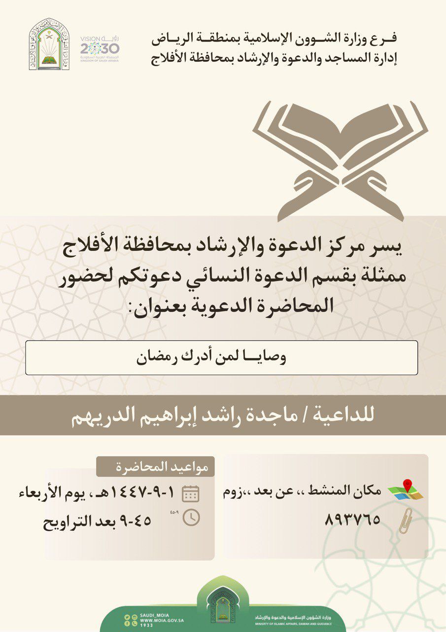 أخبار الشؤون الإسلامية بالقصيم تنفذ مناشط دعوية نسائية بمحافظة عنيزة والبكيريةتنفذ وزارة الشؤون الإسلامية والدعوة والإرشاد، ممثّلة بفرعها في منطقة القصيم، ومراكز الدعوة والإرشاد بمحافظة عنيزة والبكيرية ، اليوم الخميس 2 رمضان 1447هـ، عددًا من المناشط الدعوية النسائية، ضمن برنامج ... التفاصيل