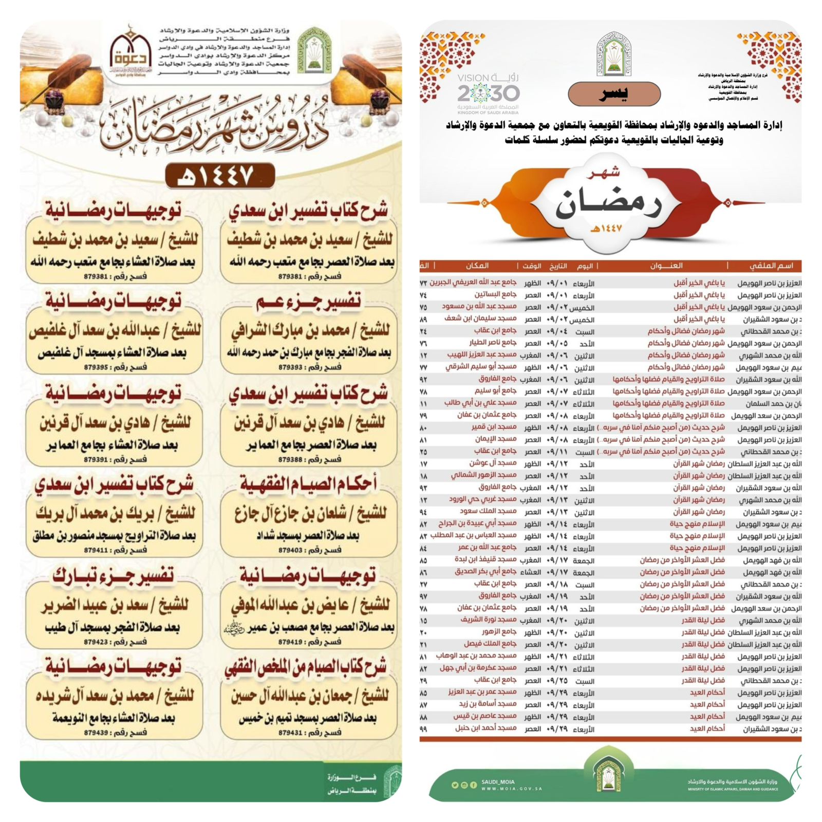 أخبار وزارة الشؤون الإسلامية تنفذ مبادرة (شهر رمضان المبارك) بمحافظة الوجه بمنطقة تبوك.نفّذت وزارة الشؤون الإسلامية والدعوة والإرشاد، ممثّلة بفرعها في منطقة تبوك، ممثلًا بإدارة المساجد والدعوة و الإرشاد، مبادرة ( شهر رمضان المبارك) في محافظة الوجه، وذلك يوم ٢٩ /٨ / ١٤٤٧هـ، وتضمنت المبادرة ... التفاصيل