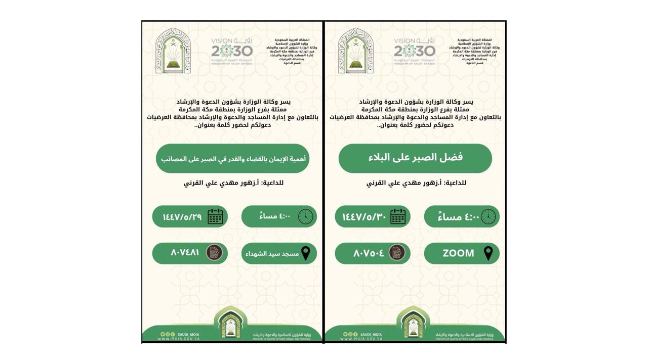 أخبار الشؤون الإسلاميه بمكة ينظم عدد من الكلمات الدعوية بمحافظة العرضيات .ينظم فرع وزارة الشؤون الإسلامية والدعوة والإرشاد بمنطقة مكة المكرمة، ممثلاً بإدارة المساجد والدعوة والإرشاد بمحافظة العرضيات ، خلال الفترة من 28- 30 من شهر جمادى الأولى لعام 1447 هـ ، سلسلة من الكلمات ... التفاصيل